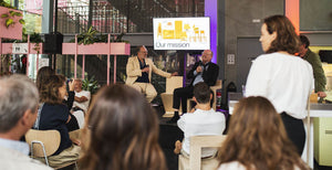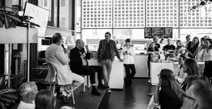 Tijdens het evenement zaten de gasten en geïnterviewden op designstoelen in Cafe Central. CEO Hans Lensvelt op het podium met Jeroen Junte, directeur van Het Centraal Museum Bart Rutten kijkt toe (midden).