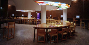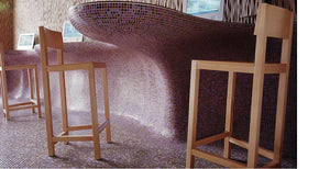 AVL Shaker barstools_ ontworpen door Joep van Lieshout, werden aangebracht op een sensueel gebogen bar bedekt met mozaïektegels.