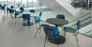 D-stoelen_ in hout worden in het atrium geplaatst