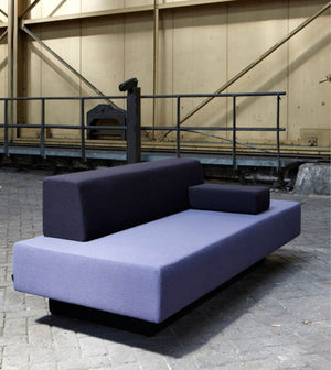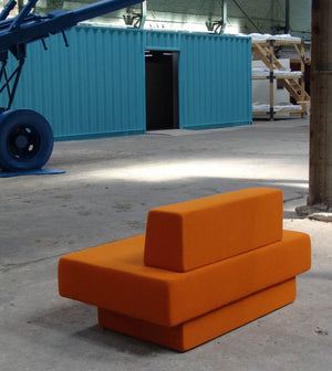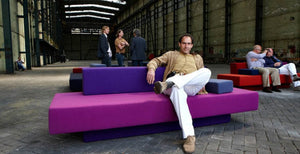 Joep van Lieshout op zijn eigen ontworpen Glyder bank