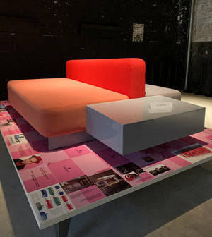 Een modulair banksysteem bestaande uit schuine fauteuils, losse banken en een chaisse longue. De schuine elementen in verschillende vormen lijken op ongelijke keien die worden onderbroken door kleine tafeltjes als rustpunten.