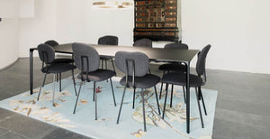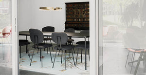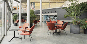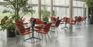 Lensvelt's W.H. Gispen stoel 201 en 202 (met en zonder armleuningen) zijn bekleed met bijpassende terracotta rode stof.
