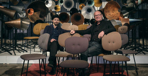 Maarten Baas en Hans Lensvelt met de Maarten Baas 101 Chair in de installatie 'May I have your attention, please?' tijdens de Milan Design Week 2017.