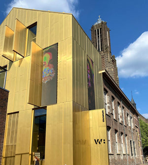 De hedendaagse gouden gevel heeft twee grote schermen waarop video-installaties van kunstenaars of informatie worden geprojecteerd. De nieuwe gevel is bekleed met een omhulsel van Tecu®Gold, een materiaal dat een nieuwe legering is van gerecycled aluminium en koper. Dezelfde gouden sfeer is terug te vinden in de entree, waar Mentjens goudkleurige wandbekleding combineerde met kleurrijke Maarten Baas stoelen in juweeltinten.