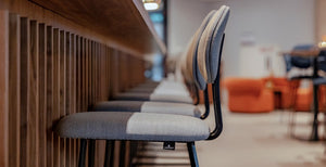 Maarten Baas barkrukken bekleed met grijze en blauwe stof.
