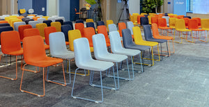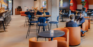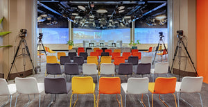 Maarten Baas barkrukken, Gispen 205 stoelen en 'Lensvelt 4000 vergadertafels' in verschillende maten in het perscentrum Nieuwspoort.