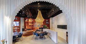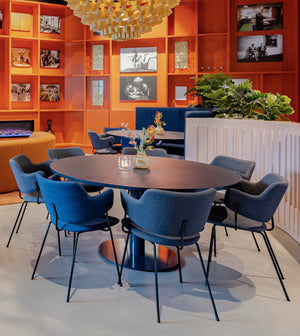 Het sociale gedeelte binnen het restaurant wordt gescheiden door een lichte, flexibele structuur. Het refereert aan een oude bibliotheek, waarbij het kabinet en de portrettenwand centraal staan.
