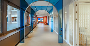 De basis is uitgevoerd in dezelfde kleurschakeringen als de andere ruimtes, maar waar het restaurant meer de nadruk legt op warme tinten, heeft deze ruimte een modernere uitstraling en meer zakelijke, koele tinten. De flexibele wanden zijn bekleed met ton-sur-ton nuances in verschillende blauwe stoffen. Als aanvulling hierop is gekozen voor een tapijt met blauwe kleurvlakken die doorlopen tot voorbij de scheidingswanden, zodat de bezoeker kan zien dat de ruimte doorloopt, zelfs wanneer de scheidingswanden de ruimte verdelen. Dit alles wordt aangevuld door projectmeubilair met uitgesproken heldere kleuren als contrast met de meer zakelijke studiolook. Dit voegt de warmte en levendigheid toe die zo past bij Nieuwspoort.