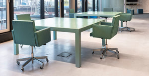 De Lazy Modernist, AVL Office stoelen en AVL Workbench in een frisse groene kleur, alle ontworpen door Atelier van Lieshout