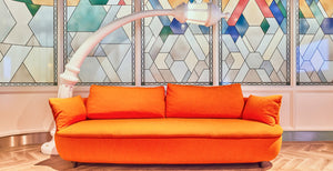 Een vrolijke 'street' vloerlamp van Seletti schijnt over de bank.