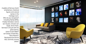 Portretten van bekende Nederlandse entertainers, historische figuren en schrijvers vormen een groot contrast met de zwarte muur.