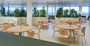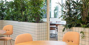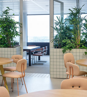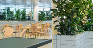 Maarten Baas 101 stoelen_ worden gebruikt om de pauzezone aan te kleden en vormen een mooi contrast met de weelderige groene planten eromheen