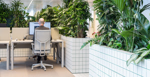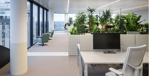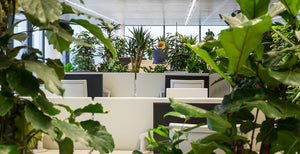 Het kantoor van Synchroon op de 14e verdieping van een recent opgeleverde toren in het centrum van Utrecht is voorzien van lommerrijke afscheidingen met meer dan 750 planten door het hele kantoor.
