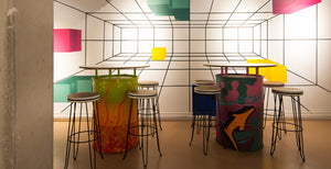 De eerste verdieping is een andere wereld, met meer grijs en donkerder, kleuren die passen bij een horecagelegenheid