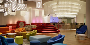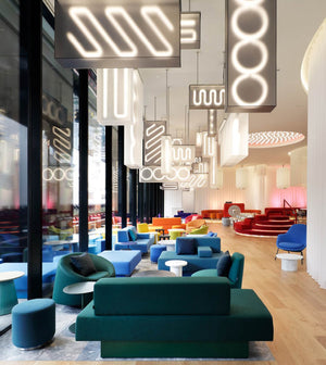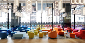 Lensvelt leverde verschillende meubels uit haar AVL Glyder collectie zoals de AVL Glyder sofa en poef in diepe en felle kleuren.