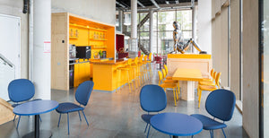 Scheiding tussen het gele gedeelte met de bar en werkplekken en het blauwe gedeelte met loungebanken