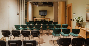 In a flexible meeting room, the upholstered Gispen 101 Chairs are combined with black upholstered D-Chairs.