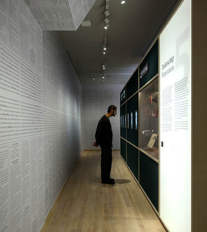 The walls of the exhibition halls are covered from ceiling to plinth with texts including anti-Jewish measures.
