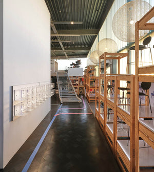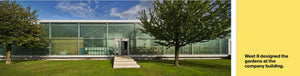 The façades hover above the public entrance and the meeting rooms on the first floor. The showroom, reception, and canteen are located on the left side of the patio, with a vast storage area on the right. Above, offices are situated on both sides of the patio. The gardens surrounding the company building were designed by West 8.