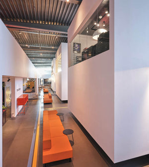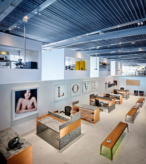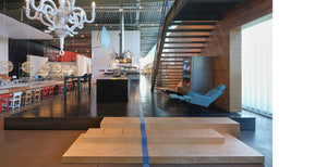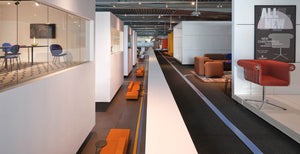 The entrance to the showroom, with an overview of the tribune on the left and the furniture lineup on the right