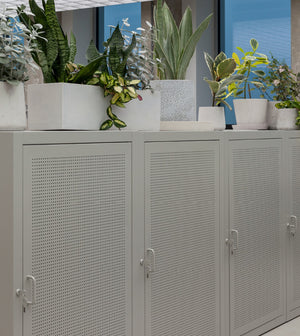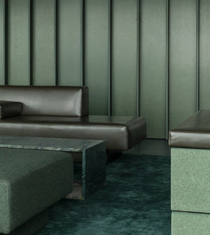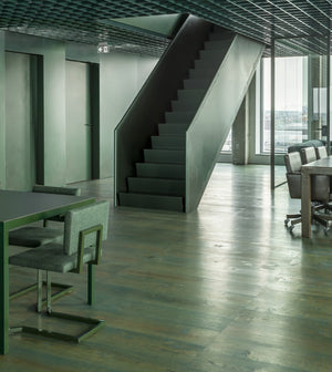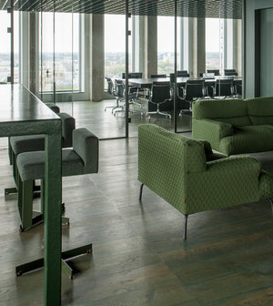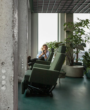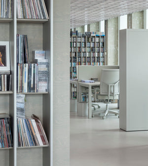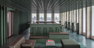 Moreover, the core resembles the inside of an amplifier, the bar doubles as a stairs and the vinyl boardroom table is also a DJ booth. While in the music industry, work and play are very much intertwined, the design seeks to separate the two and give them their own space. This way, one can either be fully focussed at work or fully relaxed at play. The division is emphasized by creating a radical material palette for work and play: grey and green, and nothing in between.