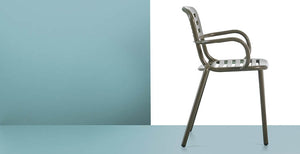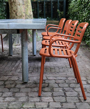 The name of the chair refers to its continuous shape; the round steel tube runs from the armrest through the seat to the legs and back again. The design guarantees maximum comfort and is resistant to all weather conditions and suitable for a long-term outdoor existence.